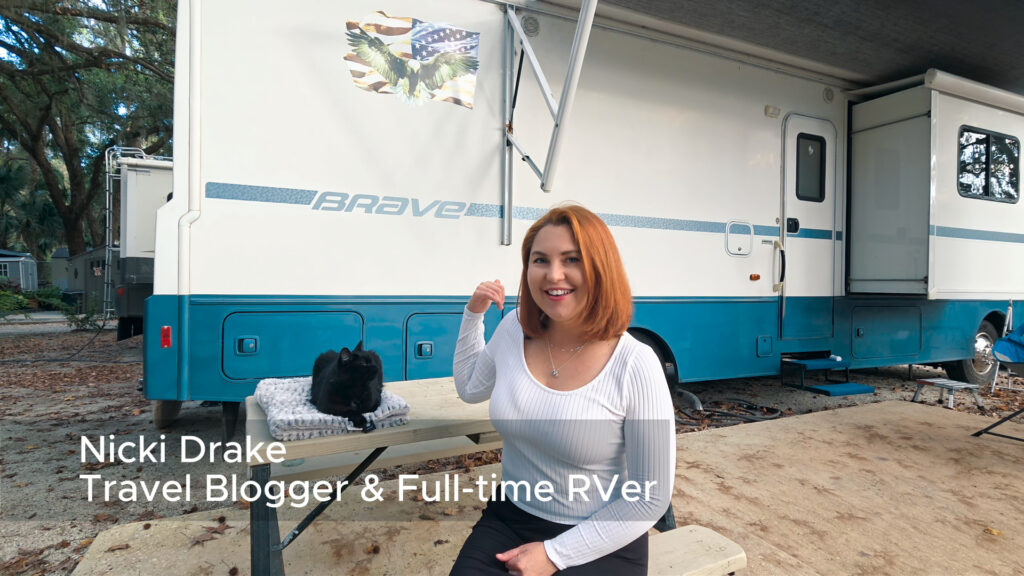 Hi, I’m Nicki, and this is Luna. We live full-time in the Winnebago behind us, and after getting so many requests for a tour, I thought I’d bring you on board and show you around. Let’s go!