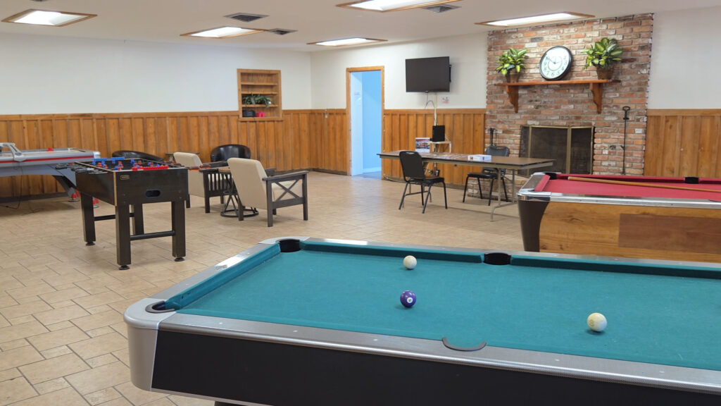 The lodge has games, seating areas, and even a free library. The meeting house hosts regular activities like bingo, and there’s an activity calendar posted with something going on most days.